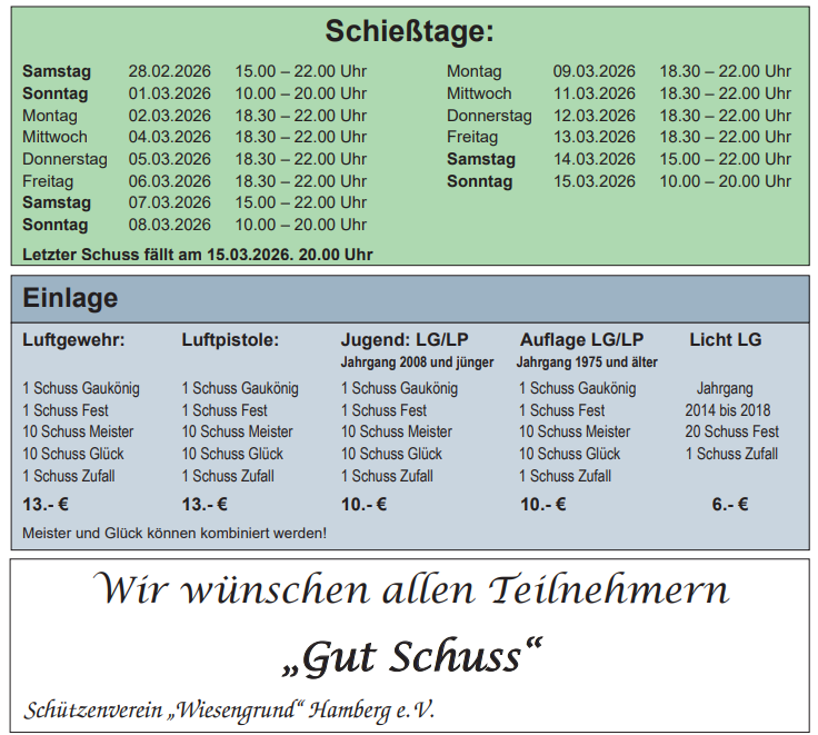 Gauschießen 2026 in Hamberg 3. Januar 2026 Thomas Ferstl Schiessprogramm-65.-Gauschiessen-HambergHerunterladen Schützenfest Beitrags-Navigation Vorheriger Beitrag130 Jahre Schützenverein Wilhelm Tell 1896 Laaber e.V.