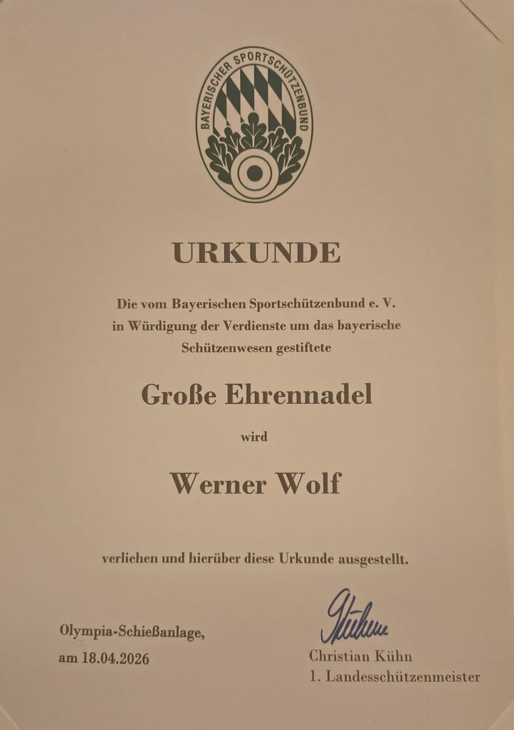 Große Ehrennadel vom BSSB an 1. Gauschützenmeister Werner Wolf